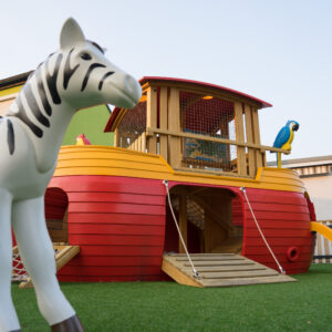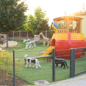 Unser Gebäude bietet viel Platz zum Spielen, Lernen und Entdecken. Die Gruppenräume sind nach den Bedürfnissen der Kinder gestaltet und es stehen verschiedene Funktionsbereiche zur Verfügung, die zum Forschen, Bauen, Rollenspielen und kreativ sein einladen. Unsere Einrichtung ist in drei Krippen- und drei Stammgruppen im Kindergartenbereich strukturiert. Zusätzlich finden die Kinder im Erdgeschoss ein Atelier, sowie einen Turnraum im Untergeschoss. Unser Garten ist mit tollen Spielgeräten ausgestattet, die die Kreativität der Kinder im Freispiel fördern. Besonders stolz sind wir auf unsere Arche Noah von der Stiftung für Kinderförderung von Playmobil im Krippengarten.